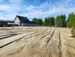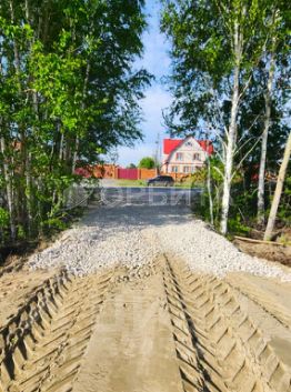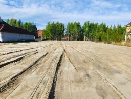 Подведены все коммуникации, сделан заезд. Участок отсыпан, поднят и разровнен. По фасаду отгорожен от дороги красивыми берёзами, по задней части растут сосны. Можно оборудовать тропинку прямо до берега.