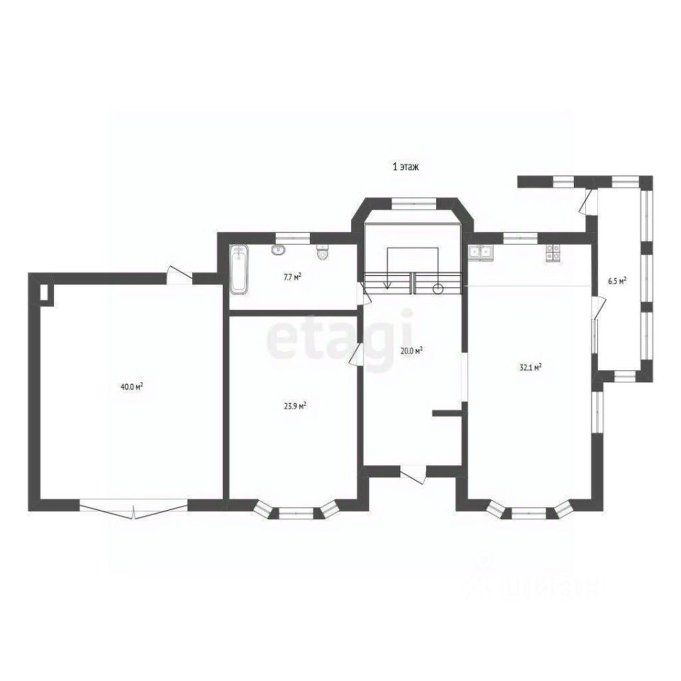 1 этаж: кухня-столовая, гостиная, гостевая комната, сан.узел, коридор.