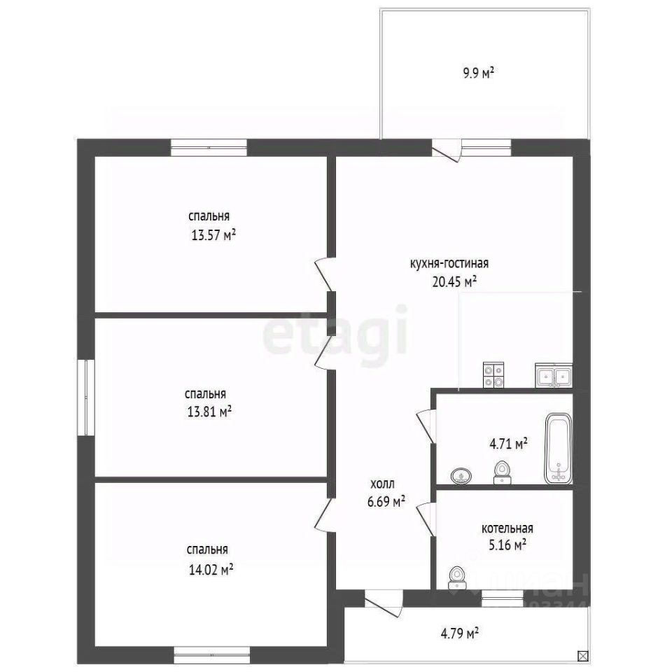Планировка: 3 спальные комнаты по 15 кв.м. с нишами под шкафы, кухня-гостиная 20 кв.м. с выходом на террасу и витражным остеклением, 2 санузла, прихожая с нишей под шкаф-купе, котельная