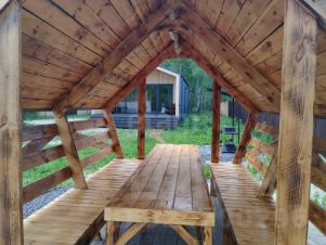 Дом с террасой 41 кв.м готовый для круглогодичного проживания. В дом заведены все коммуникации, свет, вода, имеется вся необходимая мебель для проживания, кухонный гарнитур, техника, диван, кровать, стол, стулья, кондиционер, предметы декора такие как шторы, полочки, светильники. На террасе стол и стулья.