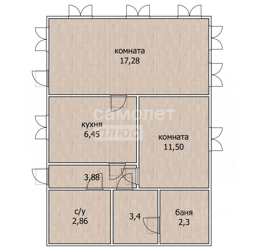 Две комнаты 17.28 м2 и 11.5м2, кухня 6.45 м2, сан. узел и баня с раздевалкой.