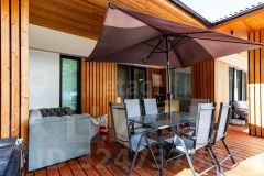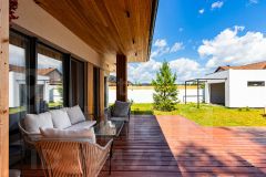 Строительство выполнено с использованием качественных материалов: стены из газобетонного блока толщиной 400 мм обеспечивают отличную теплоизоляцию, а фасады оформлены декоративной штукатуркой и белой финишной краской марки Ceresit, что не только подчеркивает современный стиль, но и гармонично комбинируется с террасой из лиственницы, создавая контраст и элегантный вид.