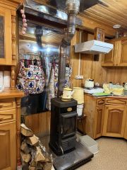 На первом этаже расположена крытая веранда, просторная кухня с камином, гостиная с камином и отдельная спальня.