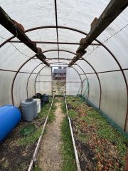 Многолетняя красивая ель на участке. Сарай. Теплица.