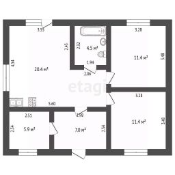 Дом площадью 60.6 кв.м с двумя комнатами и просторной 20,4м2 кухней-гостиной, где кухонная зона выделена, что обеспечивает удобство при готовке и комфортное размещение гостей.