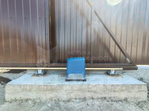 Забор: фасад из кирпича профнастил, установлены откатные ворота.
