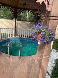 На участке: баня из кедра, круглый бассейн 3 м под крышей, летняя кухня с зоной барбекю, вольер для собаки.