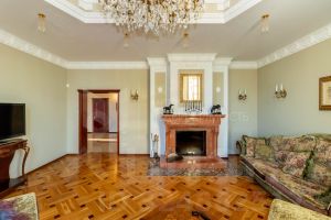 Дровяной камин из натурального камня. Окна высотой 6 м. Функция второго света реализована с помощью роскошной люстры. Мягкие диванчики и кресла, на полу штучный паркет. Все элементы этой комнаты делают ее невероятно атмосферной.