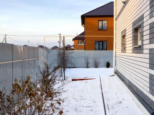 Дом по периметру огорожен забором и украшен новогодней гирляндой!