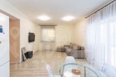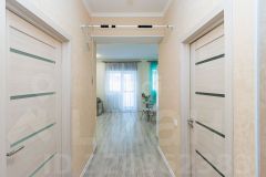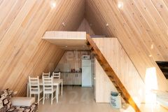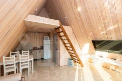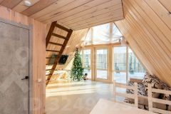 Основной дом предлагает просторную кухню-гостиную с панорамными окнами и выходом на террасу, а также комнату для родителей и санузел с душевой на первом этаже. На втором этаже расположены две детские комнаты и ванная комната, а в коридоре находится лестница на третий мансардный этаж.