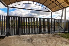 Участок огорожен забором, подключено видеонаблюдение. Установлены откатные ворота и калитка. Организовано парковочное место для автомобиля с навесом.