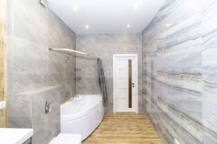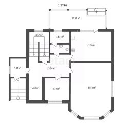 - На первом этаже (с полностью теплым полом) располагаются котельная, гостевой санузел, гардероб, кухня с выходом на террасу с видом на лес, гостиная и спальня-кабинет.