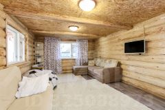 Дом выполнен из бревна и обшит. Окна деревяные. На первом этаже выполнен хороший ремонт. Просторная светлая комната. Кухня оборудована кухоным гарнитуром с электро плитой и обеденной зоной. На закрытой терассе еще одна комната с лесница на второй этаж.