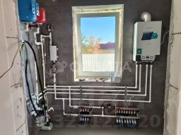 Дом построен на фундаменте из монолитной плиты толщиной 300 мм, стены выполнены из блока поревит толщиной 400 мм, а облицовка выполнена из кирпича. Отопление осуществляется от теплого пола, электричество заведено в дом с напряжением 380 В, вода подается из колодца глубиной 11 колец, а канализация представлена септиком из четырех колец, который можно переделать в переливной.