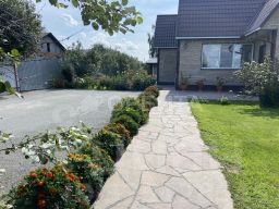 Есть мангальная зона выложенная из кирпича с навесом ,все дорожки от дома до бани и мангальной зоны выложены натуральным камнем. Подъезд к дому и площадка под машину покрыты асфальтом.