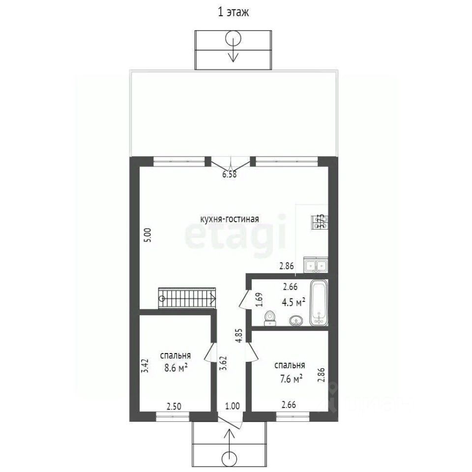 — 1 этаж: просторная кухня-гостиная, две уютные спальни и санузел.
