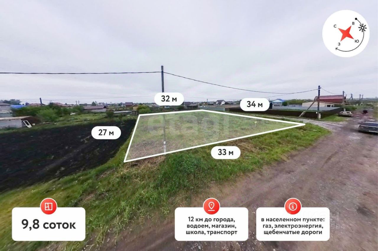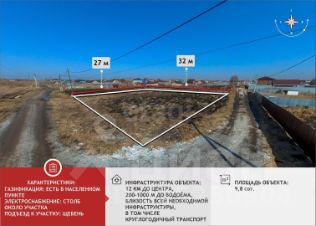 ОБ ОБЪЕКТЕ: земельный участок, площадью 9,8 соток, который расположен вблизи от города Тюмени, по Салаирскому тракту,район Казарово, рядом пос.Березняки. Участок угловой.