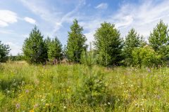 На участке растёт сосна, грибы и земляника.