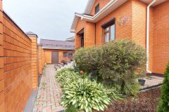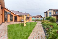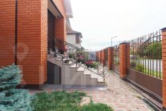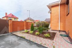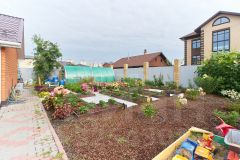 Участок площадью 10 соток имеет правильную прямоугольную форму. Ухожен и благоустроен брусчатыми дорожками и многолетними насаждениями, организован точечный полив растений. Для любителей огорода имеется теплица, грядки с насаждениями. Участок огорожен капитальным высоким забором, фасадная часть забора выполнена из кирпича, кованые резные ворота и калитка. Придомовая территория также облагорожена приятным газоном.