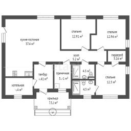 Функциональная планировка включает в себя две уютные комнаты по 13 м², мастер-спальню 12,5 м² с собственным санузлом 4,5 м² и гардеробной зоной 3,2 м². Также предусмотрен дополнительный санузел 4,5 м² и постирочная 5,7 м², что обеспечит вам максимальный комфорт. Просторная кухня-гостиная площадью 37,4 м² станет идеальным местом для семейных ужинов и встреч с друзьями.