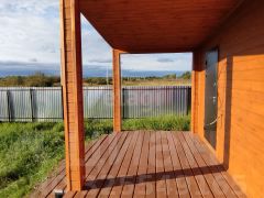 Планировка 1+, спальня 9 м2, кухня гостиная 22 м2 с панорамными окнами, санузел 5 м2, а еще терраса под крышей 15 м2! Отделка внутри дерево, снаружи комбинированная дерево+сайдинг. Скрытая электрическая разводка по всему дому, установлены светильники, розетки выключатели, вывод для кондиционера.