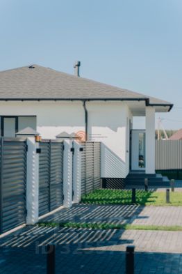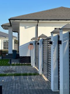 Забор по фасаду с воротами и калиткой — приватность с первого дня.