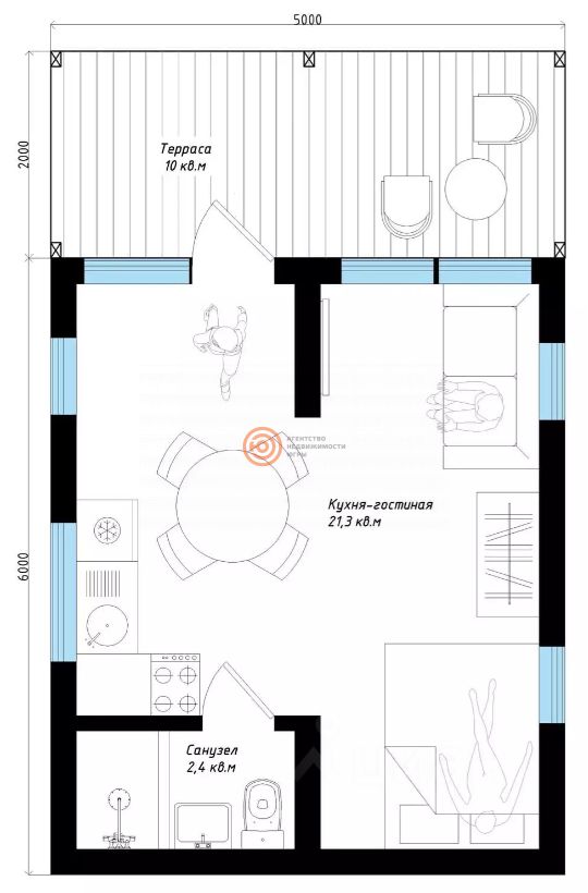 При входе в дом мы попадаем в просторную кухню-гостиную со спальной зоной. Изолированный санузел, который включает в себя: унитаз, раковину с тумбой, душевой поддон, бойлер-всё что нужно для комфортного пребывания в доме. Дом подходит для супружеской пары любого возраста или для одного человека. Несмотря на свои компактные размеры, в доме уместилось всё необходимое для комфортной жизни.