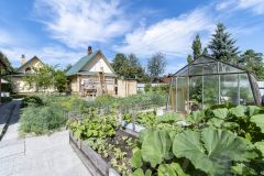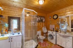 Кроме основного дома, на участке есть баня площадью 29,6 кв. м на дровах, гараж на 26,5 кв. м, беседка (8,2 кв. м) и закрытая мангальная зона (6 кв. м) с печью для казана. Территория благоустроена: дорожки выложены плиткой, газон занимает около 4 соток, есть огородная зона и стеклянная теплица площадью 18 кв. м. Плодоносящий сад включает яблони, вишни, сливы, ягодные кустарники (смородина, облепиха.клубника, малина, крыжовник, голубика), а также декоративные деревья — лиственницы, липу и колоновидные яблони. Полив растений осуществляется через водопровод, подключенный к озеру, с разводкой по всему участку.