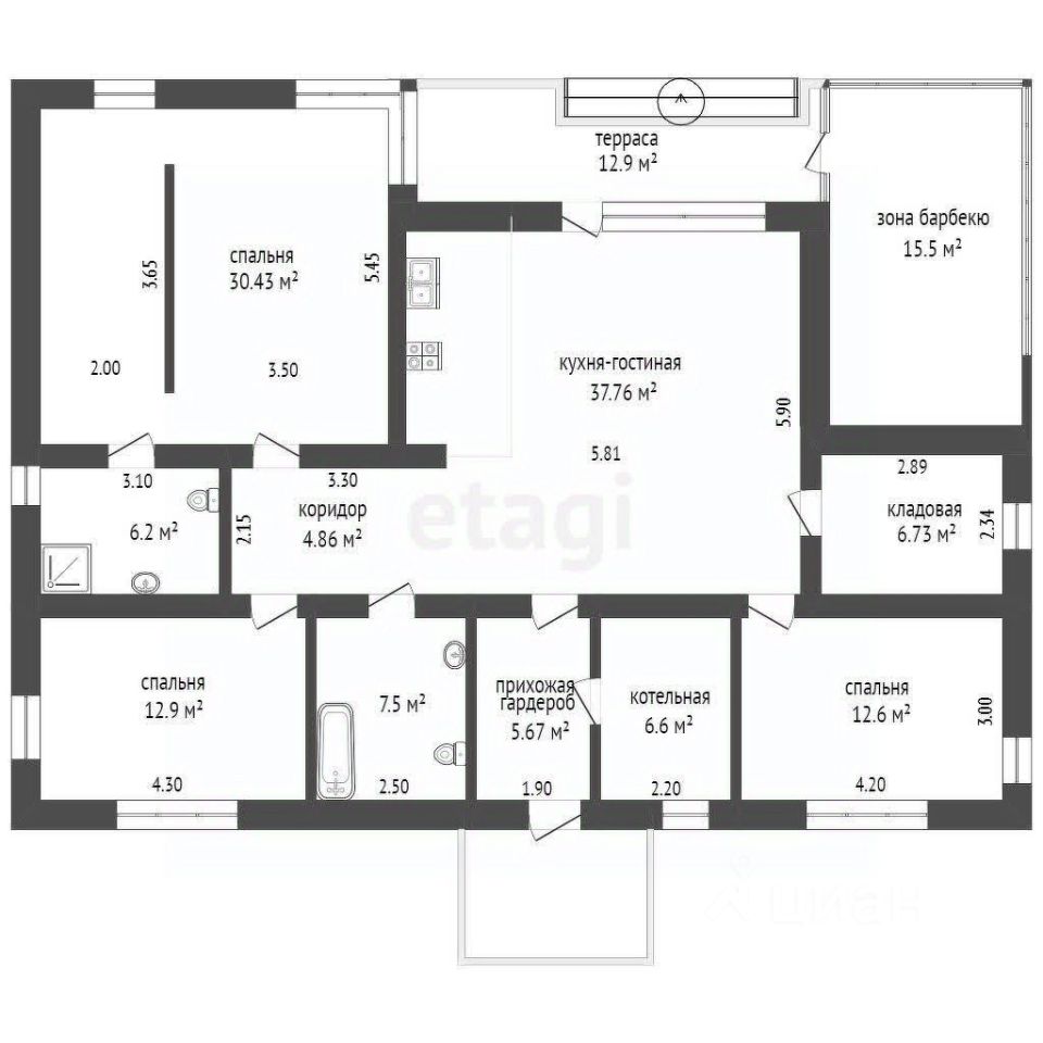 - Уютная хозяйская спальня с гардеробной (30,43 м²) и собственным санузлом (6 м²).