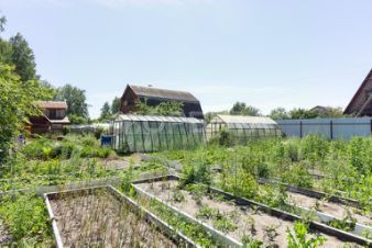Насаждения: вишня, яблоня и крыжовник, многолетние цветы, взрослая лиственница, берёзы.