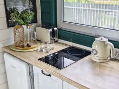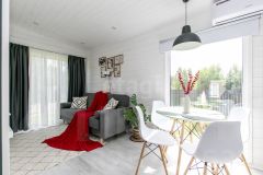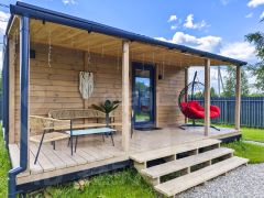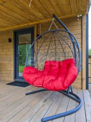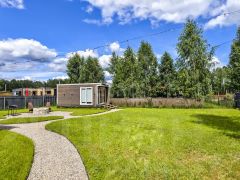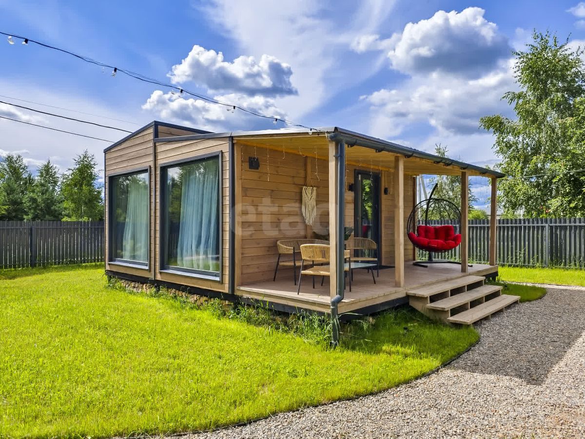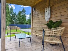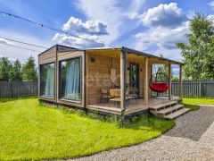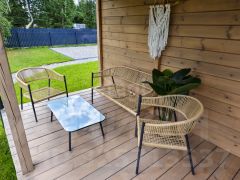 На высоком ровной красивом участке 6 соток правильной формы расположились модульный дачный дом 35 кв.м состоящий из кухни-гостиной, спальни, зоны прихожей, с/у и конечно же большой открытой 10-метровой террасы, где комфортно разместилась садовая мебель и большое (подходит для пары) подвесное кресло-качеля.