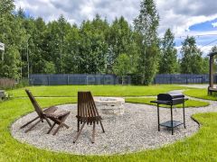 Участок огорожен стильным забором из профнастила. Две симпатичные березы растут на территории. Мы так же посадили несколько красивых елок, яблонь, вишень, розовых кустов, которые будут расти и непременно радовать вас. Весь участок преимущественно - это плюшевый зеленый газон, а так же аккуратные, отсыпанные мелкой щебенкой дорожки, зона барбекю и большая зона для парковки авто.