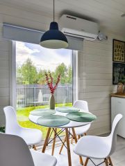 Все предметы интерьера в безупречном состоянии - мы ими пользовались недолго и очень бережно. Предусмотрели все тонкости для комфортной загородной жизни - не забыли про кондиционер (что бы летом было свежо), в зоне гостиной большой проектор - дети были в восторге от просмотров любимых мультфильмов на даче на большом экране, приобрели великолепный мангал-барбекю.