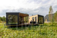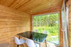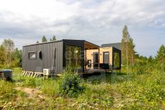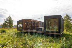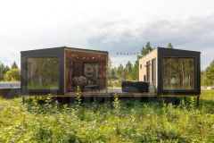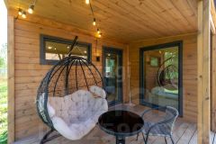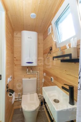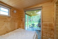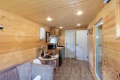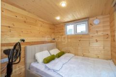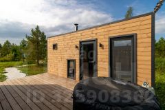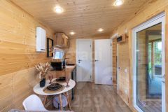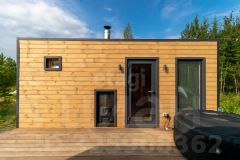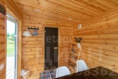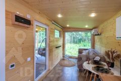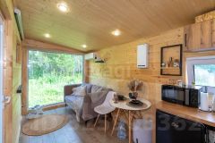 Дом состоит из 2-х комнат с деревянной обшивкой стен, в кухне-гостиной остается кухонный гарнтитур с техникой (холодильник, СВЧ-печь), обеденная зона, также здесь установлен проектор, проведен wi-fi, имеется система очистки воздуха и кондиционер. В спальне стоит вместительная кровать, установлен приточный клапан. В санузле организована душевая с отделкой герамогранит. Качественный бойлер с большим объемом бака (50 л) не оставит вас без горячей воды. Обогревается дом за счет теплого пола и конвекторов отопления.