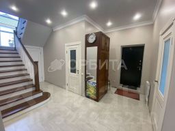 Дом выполнен в стиле "евро", что подразумевает высококачественную отделку. Просторная кухня-гостиная объединяет пространство, создавая атмосферу уюта и тепла. На первом этаже также расположены гардеробная, санузел и котельная. На втором этаже находятся три уютные спальни и большая ванная комната. Лестница из натурального дерева добавляет шарма и стиля.