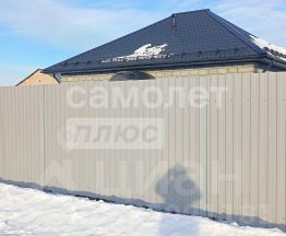 Забор сделан из профнастила высотой 2м, ворота -откатные 5 метров, калитка.