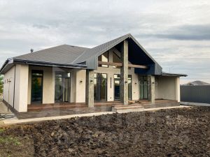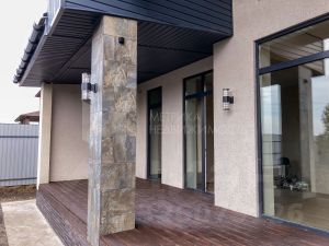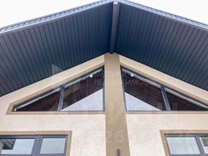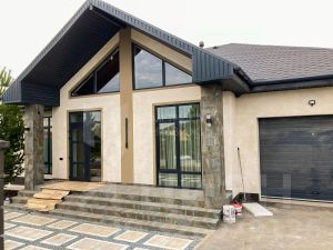 Дом из газоблока Поревит, фасад-сочетание фасадной штукатурки и фасадной системы АМК (декоративная отделка из гранитной крошки), кровля-металлочерепица с водосточной системой, утепление потолка-минеральная вата 200 мм, фундамент-утеплённая шведская плита.