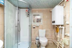 В ванной комнате выполнена качественная отделка — стены обложены кирпичом и керамической плиткой, что гарантирует долговечность и легкость в уходе.