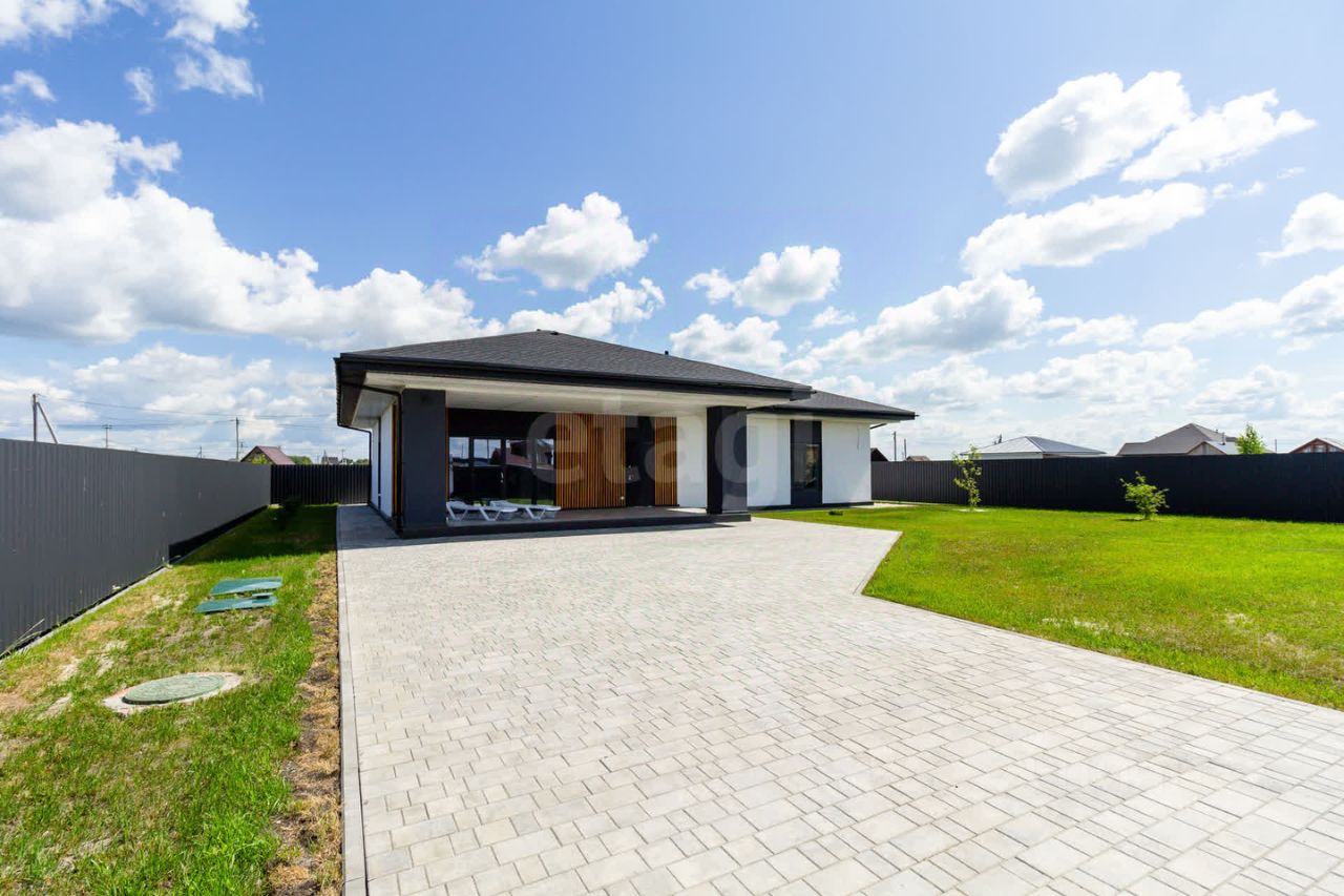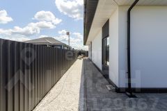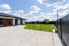 Ваш новый дом окружен облагороженным участком, который готов для использования. Подъездная группа во дворе выполнена из брусчатки, что придаёт территории завершенный и стильный вид. Забор по периметру обеспечивает безопасность и уединение, а откатные ворота добавляют удобства при въезде.