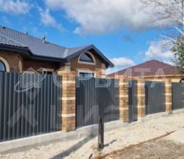 • Ограждение из кирпичных столбов и профнастила , электро-откатные ворота и входная калитка .