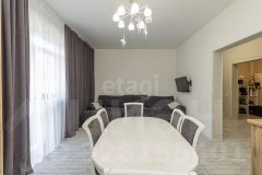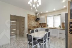 На стенах - обои светлых тонов на флизелиновой основе, натяжные потолки. На полу - керамогранит. Теплый пол по всему дому с возможностью регулировки отопления + радиаторы. В санузле - керамическая плитка, ванная коната полностью оснащена. В каждой комнате установлены качественные межкомнатные двери, тройные стеклопакеты, качественная входная дверь.