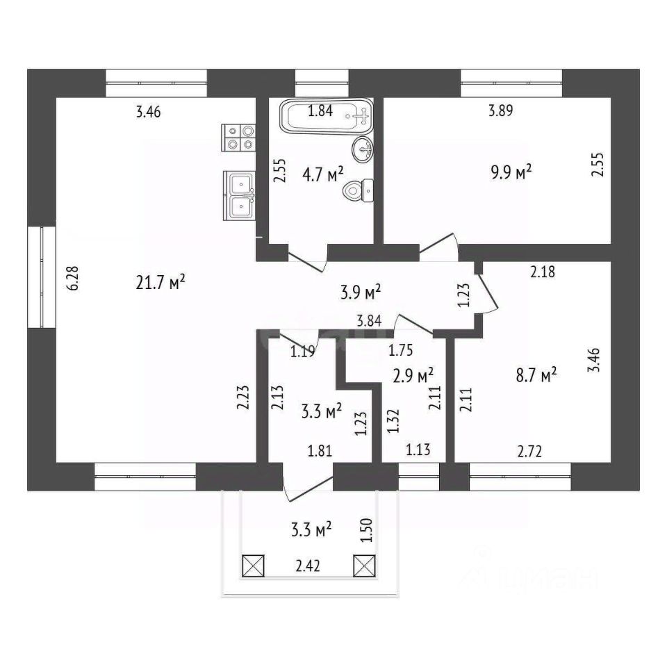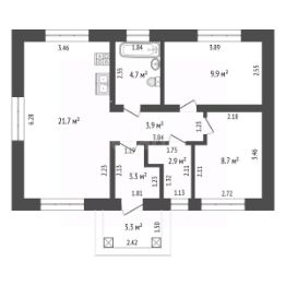 Планировка: кухня-гостиная 21,7 м² и 2 спальни, оптимально для семьи