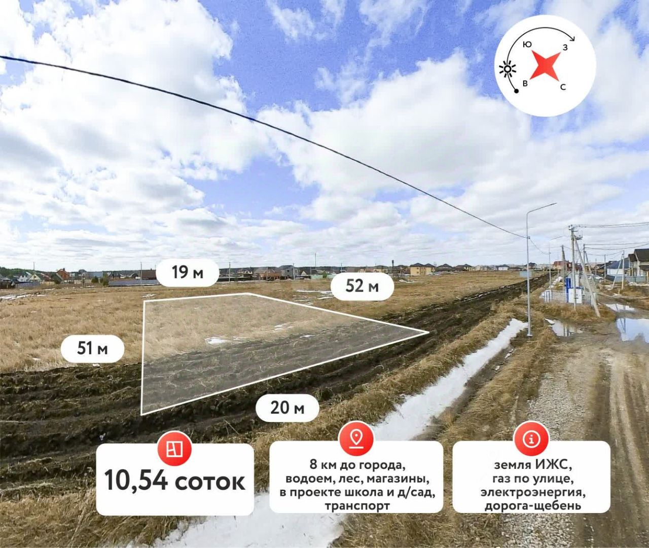 Площадь 10,5 соток, правильной прямоугольной формы — идеальное место для строительства вашего загородного дома мечты. Участок находится в активно развивающемся районе, где уже проведены электричество, газ и интернет, что обеспечит вам комфортное проживание.