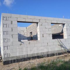 Дом площадью 65 м² возведен из поревита, внутренние перегородки выполнены из керамзитобетона и силикатного блока. Существующая планировка позволяет достроить второй этаж, увеличив жилую площадь. Фундамент представляет собой монолитную плиту размером 8х10 метров, обеспечивающую надежность конструкции. К участку подведены электричество и газ, что упрощает дальнейшее строительство и благоустройство. Водоснабжение отсутствует, что потребует организации скважины или иного источника воды.