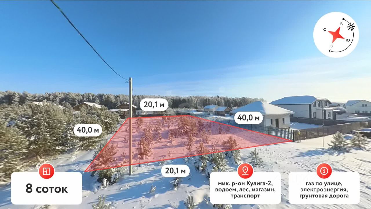 Срочная продажа ! Продается земельный участок площадью 8 соток в поселке Кулига Участок имеет правильную прямоугольную форму и расположен на первой линии, что обеспечивает удобный подъезд с двух сторон. Близость к лесу , создает приятную природную атмосферу и гарантирует чистый воздух, что особенно ценно для тех, кто ищет спокойное место для жизни или отдыха.