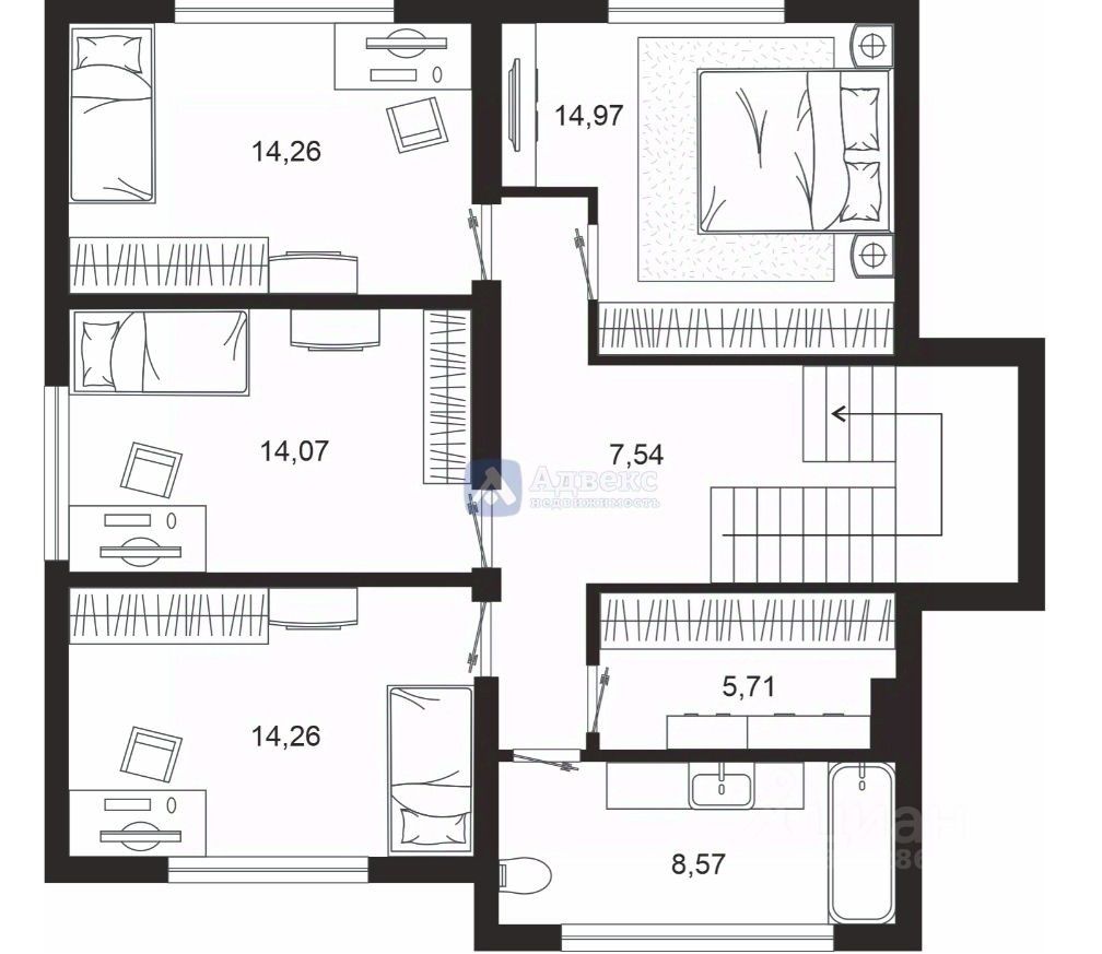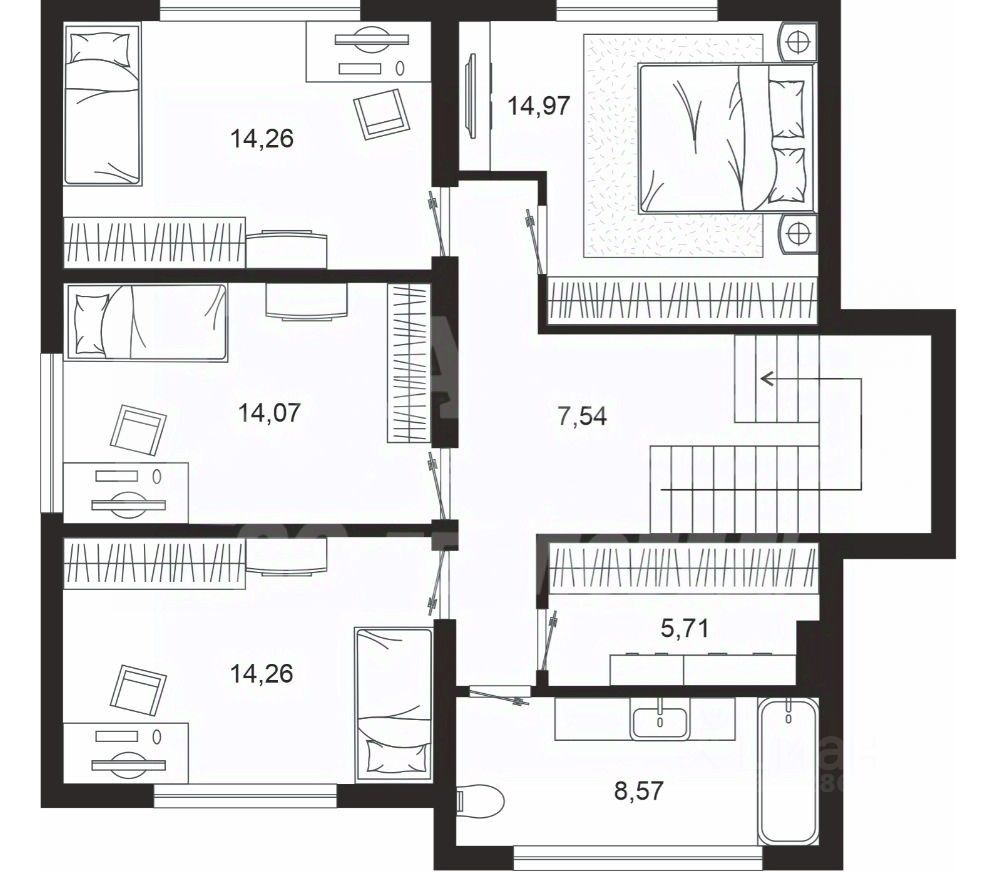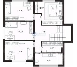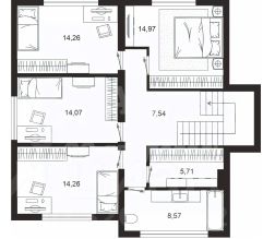 четыре уютные комнаты правильной геометрической формы площадью 14,97 кв.м., 14,26 кв.м., 14,07 кв.м. и 14,26 кв.м., что обеспечит личное пространство для детей и родителей. Из окон комнат полноценно просматривается игровая зона и искусственный водоем.