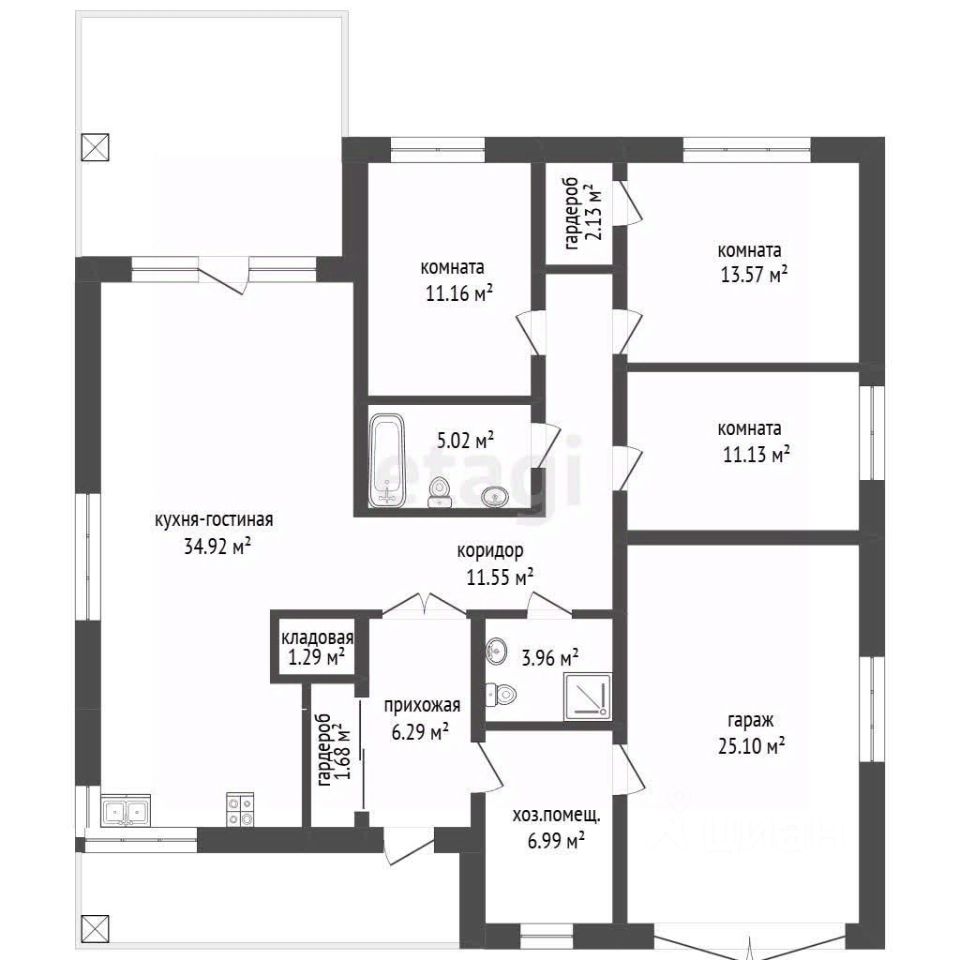 Общая площадь дома составляет 122 квадратных метра, включая просторную кухню-гостиную площадью 30,9 кв. м., а также три спальни — 18,2 м², 17,5 м² и 16 м². Кроме того, в доме есть санузел площадью 6 м², гардеробная — 5,3 м² и котельная — 3,2 м². На веранде площадью 12,5 м² можно проводить время в тёплое время года, а просторная прихожая площадью 14,3 м² станет идеальным местом для встречи с гостями.