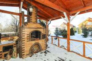 Зона-барбекю под навесом с большой русской печью, мангалом, коптильней, зоной для приготовления пищи.