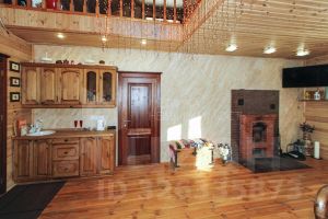 Баня два этажа, печь-камин полностью из кирпича, включая парилку, санузел, кухонный гарнитур, массивный большой стол в гостиной для приема гостей, на втором этаже зона отдыха с диваном.