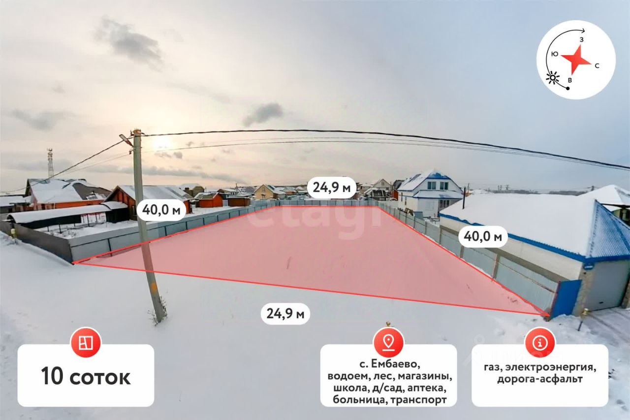 Продается прекрасный земельный участок площадью 10 соток в живописном селе Ембаево! Это идеальное место для строительства дома вашей мечты и создания уютного семейного гнездышка в гармонии с природой и удобствами современной жизни.